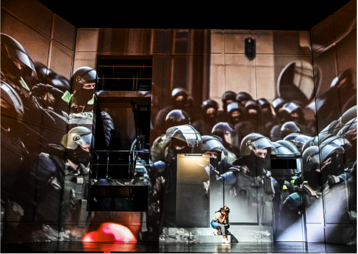 Doch nicht nur die Kostümgestaltung, auch das drehbare Bühnenbild spielt mit der Farbpallette hell und dunkel und natürlich rot – also letztlich den helvetischen Farben. Und dies verleiht der Aufführung einen stimmigen Grundtenor. Die Regisseurin Amélie Niermeyer kreiert eindrückliche Bilder der beschworenen Mythen Tell, Freiheit und Gerechtigkeit, die für eine angeblich unabhängige und neutrale Schweiz stehen – und verlinkt diese mit aktuellen Geschehnissen. So sind bewegte Bilder auf den Hintergrund projiziert. Zu sehen sind Videos von zerstörten ukrainischen Städten und Polizeigewalt auf der ganzen Welt und Bilder unendlicher Flüchtlingsströme.