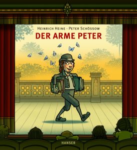 Peter Schössows Bilder lassen Heines Gedicht vom unglücklich verliebten Peter in neuem Glanz erstrahlen, verleihen ihm zusätzlichen Spiel-Raum: Vor der Silhouette Hamburgs entspinnt sich die Geschichte einer packenden Theateraufführung, in der die Zuschauer eine ebenso wichtige Rolle spielen wie die Akteure auf der Bühne. Überraschend und faszinierend sind die vielen Nebenhandlungen und neuen Zusammenhänge, die Schössow in und mit seinen Bildern erzählt und schafft. Und das nicht nur, wenn der eben auf der Bühne verstorbene Peter im Anschluss an die Vorstellung putzmunter davonspaziert.