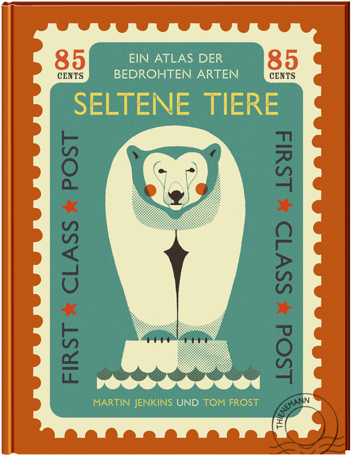 Auf der linken Buchseite erklärt jeweils ein längerer Text Wissenswertes, ein kurzer Steckbrief liefert zusätzlich biologische Fakten und eine Landkarte hilft, den Lebensraum des jeweiligen Tieres geografisch zu verorten. Daneben – auf der rechten Buchseite – sieht man grossformatig die Tiere, gezeichnet von Tom Frost. Klassisch und in mattem Retrostil zeigt er Momentaufnahmen und umrahmt die mal mehr und mal weniger gefährdeten Tiere mit Hilfe der Briefmarkenform. Frost ist übrigens selbst begeisterter Sammler von alten Briefmarken.
